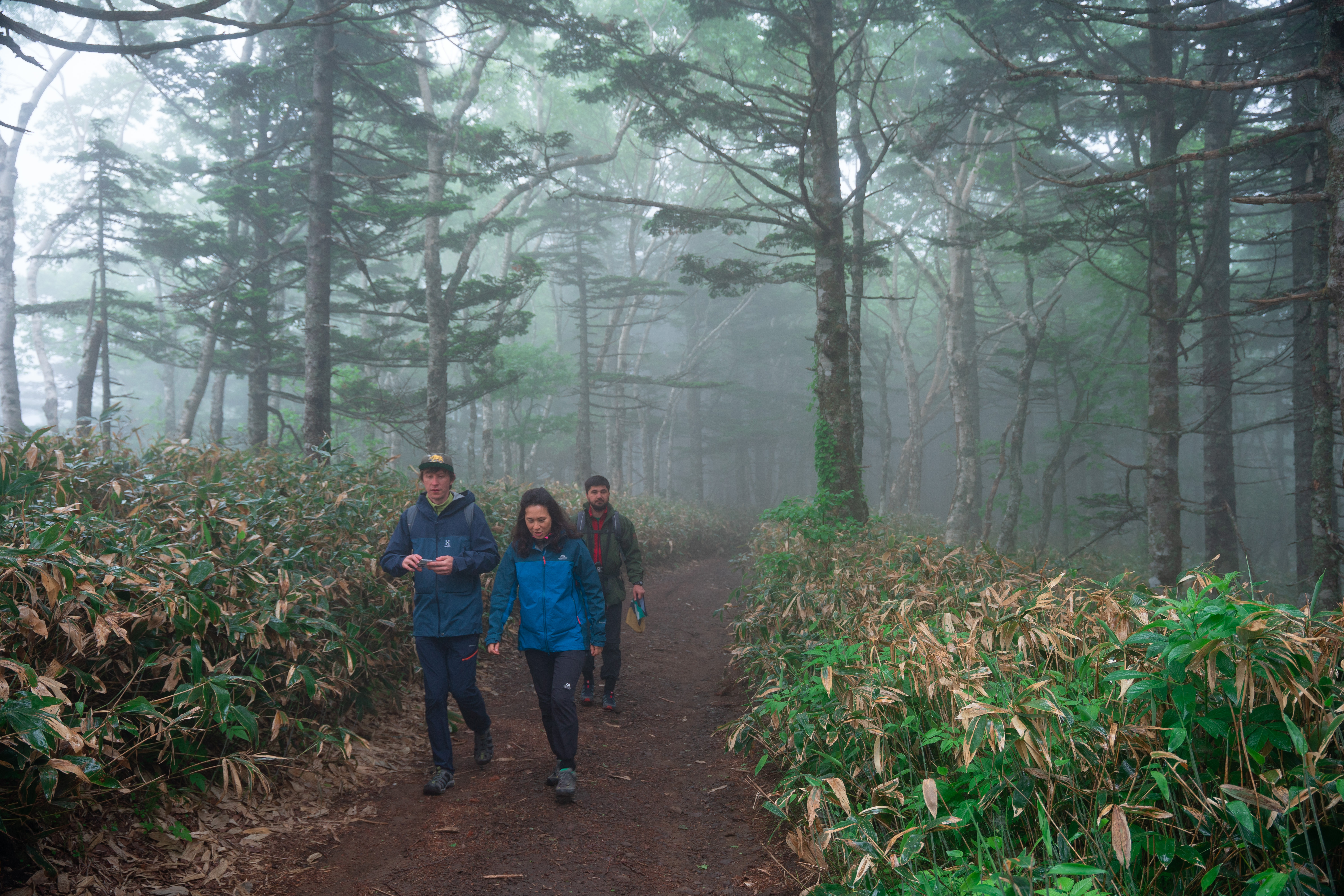 Отправление на маршрут по лесной тропе через заросли бамбучника. Трекинговый маршрут, от места стоянки транспорта до фумарольных полей составляет 3,5 км (туда – обратно 7 км). Маршрут проходит через бамбучник высотой около 1,5 – 2 метра